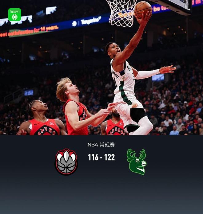 第四节猛龙RJ-巴雷特拿下9分,雄鹿科尔-安东尼拿下9分,最终猛龙116-122不敌雄鹿